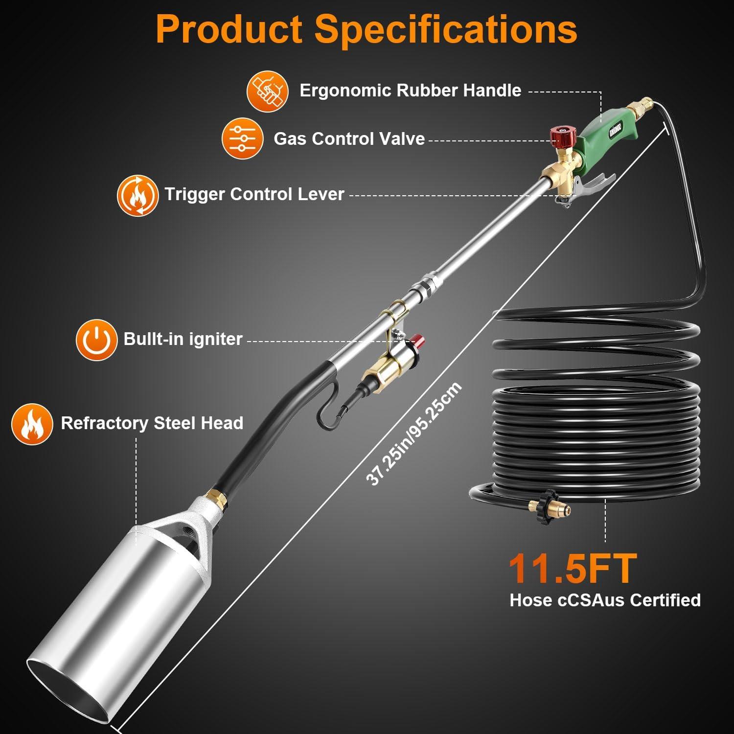 【High Safety and Double Guarantees】100% passed high standard leak test before shipping. This propane weed torch also contains internal safety mechanisms that restricts 99% of propane flow, in case of leakage. All steel parts are built with heat-stable steel, enhanced anti-corrosion eliminated risk of leakage in long time.